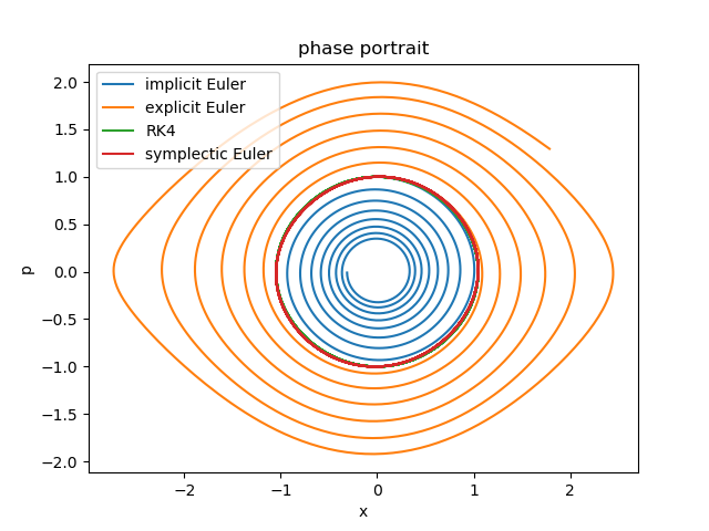 As a motivating example we will consider the time integration for a simple pendulum and how its energy is preserved during the time stepping. For that we compare the symplectic Euler scheme (which is of 1st order) to the Runge-Kutta scheme (which is of 4th order). Please have a look at the basic python implementation.