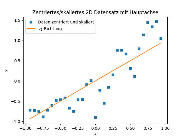 Im Hinblick auf die nächste Vorlesung, in der wir Anwendungen und Eigenschaften der PCA untersuchen werden, noch ein Plot der Daten mit der \(v_1\)-Richtung als Linie eingezeichnet.