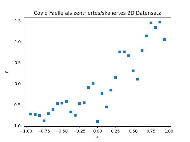 Wir nehmen noch einmal die Covid-Daten her, vergessen kurz, dass es sich um eine Zeitreihe handelt und betrachten sie als Datenpunkte \((x_i, y_i)\), \(i=1,\dotsc,N\), im zweidimensionalen Raum mit Koordinaten \(x\) und \(y\).